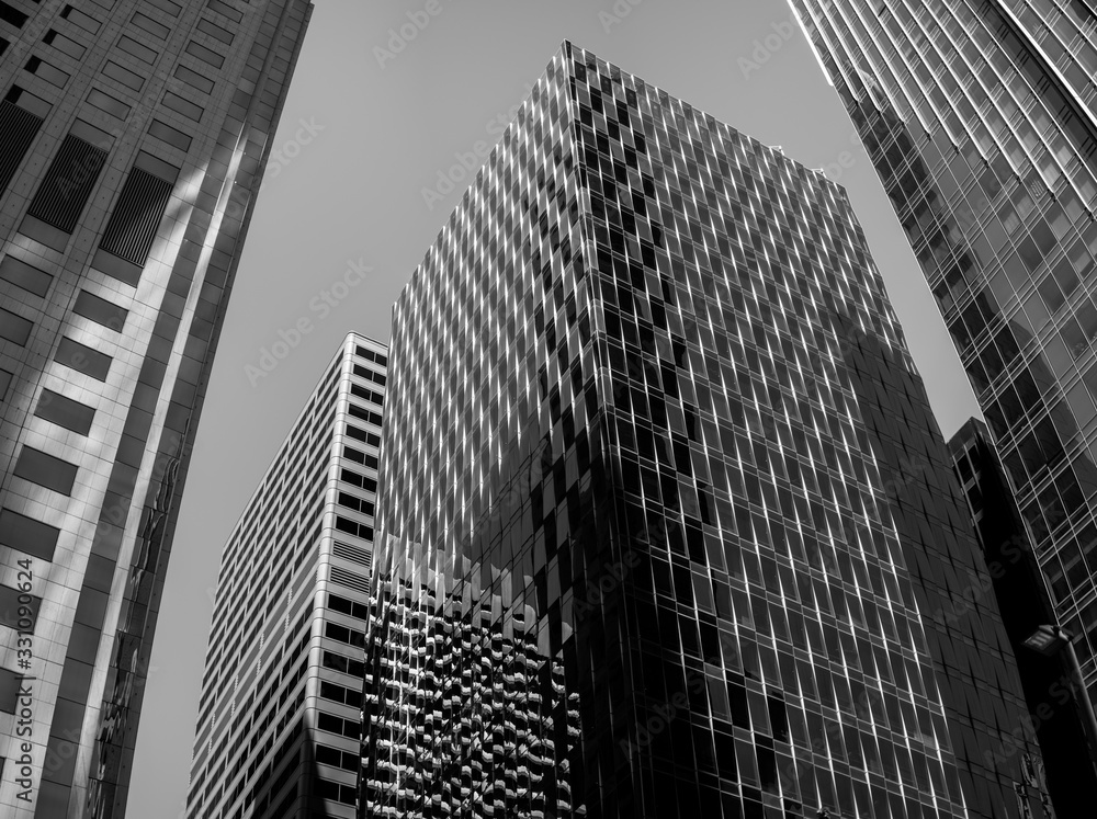 Fototapeta Low angle shot of a modern building with glass panels at the financial district