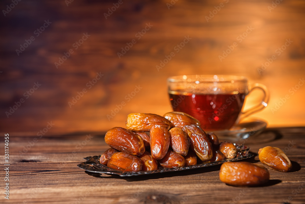 Fototapeta dates and cup of tea, concept of muslim feast holy month Ramadan Kareem, copy sp