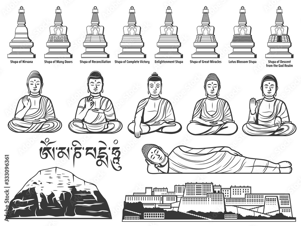 Fototapeta Buddhism religion symbols with vector sketches of Buddha statues with different hand positions or mudras, Tibetan Buddhist Great Stupas, Potala Palace and sacred Mount Kailash