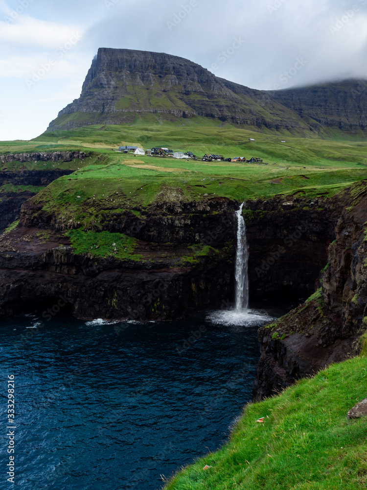 Fototapeta Faroe Islands, famouse Mulafossur Waterfall, its water falling into the ocean