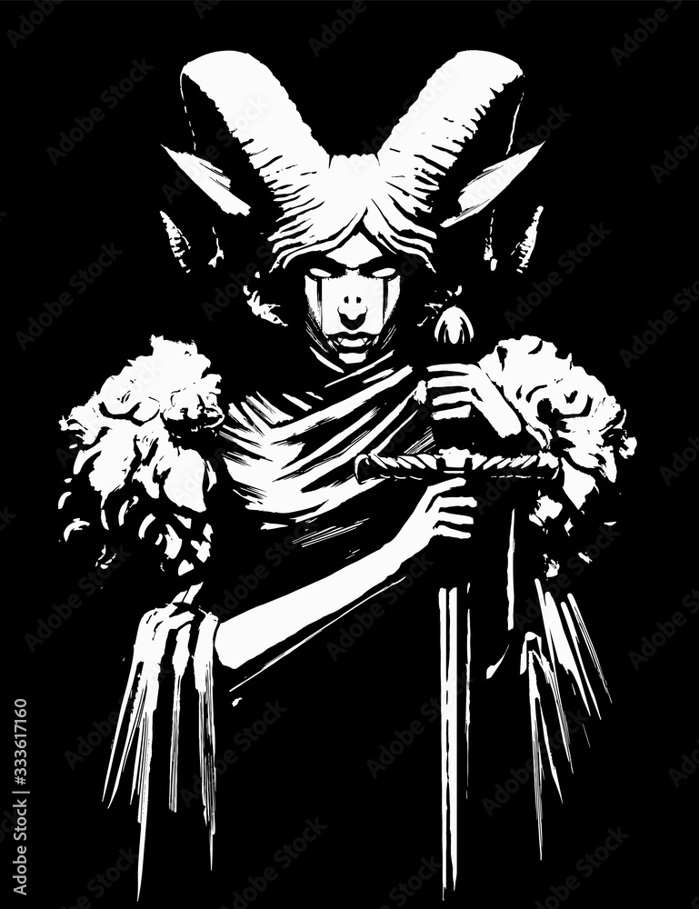 Fototapeta A statue of a satyr girl with large horns and a sword in her hands, she is dressed in a tunic with woolen shoulders