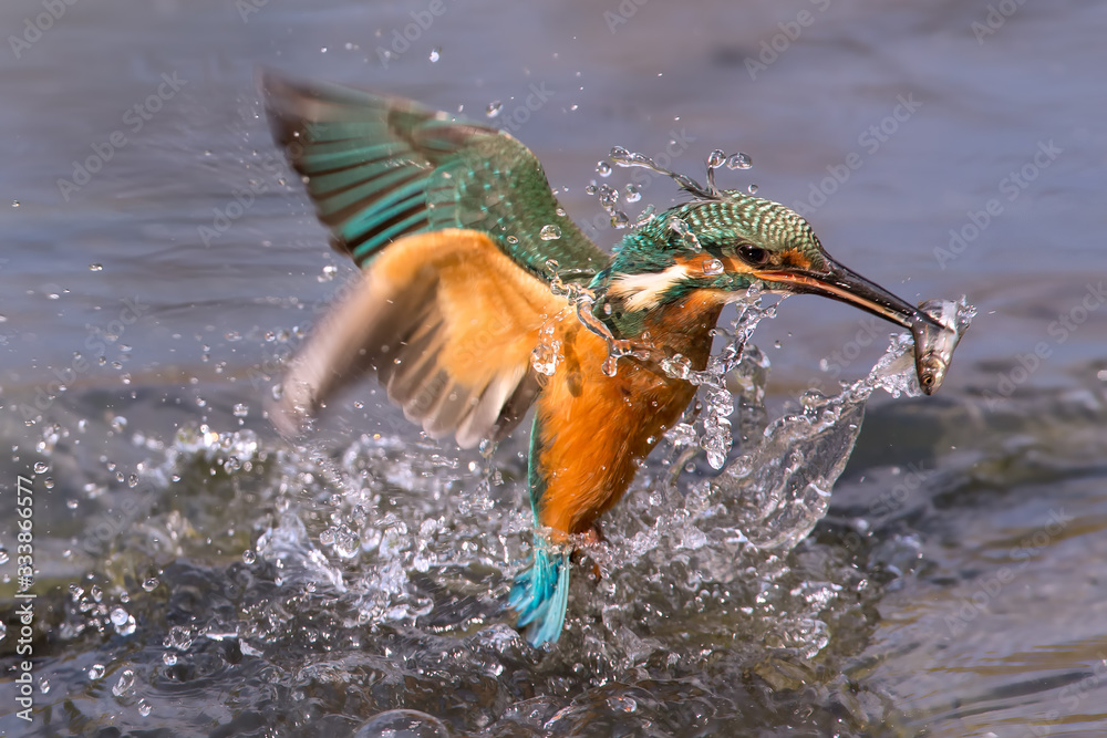 Fototapeta Kingfisher ( alcedo atthis ) bursts from the water with a fish in it's beak