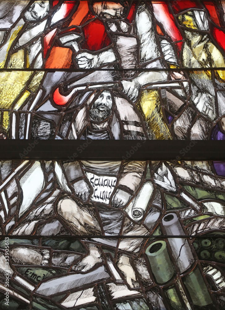 Fototapeta God bears the guilt of all mankind, takes hold of sinners and saves them from death, detail of stained glass window by Sieger Koder in St