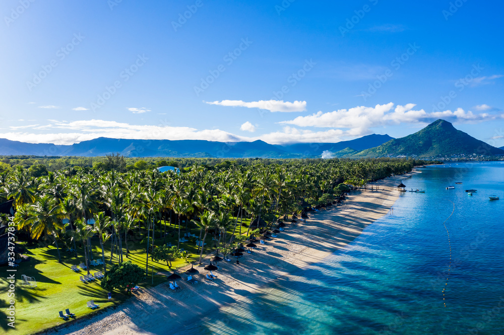 Fototapeta The beach at Flic en Flac with luxury hotels and palm trees, behind the mountain