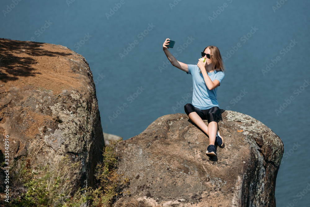 Fototapeta Young beautiful girl sits on a rocky ledge in the mountains, eats an apple and takes a selfie