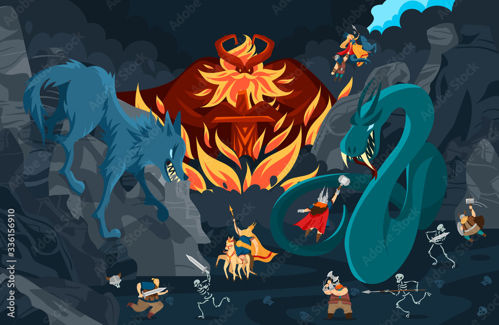 Fototapeta Viking gods, norse mythology people and monsters cartoon characters, fight scene vector illustration