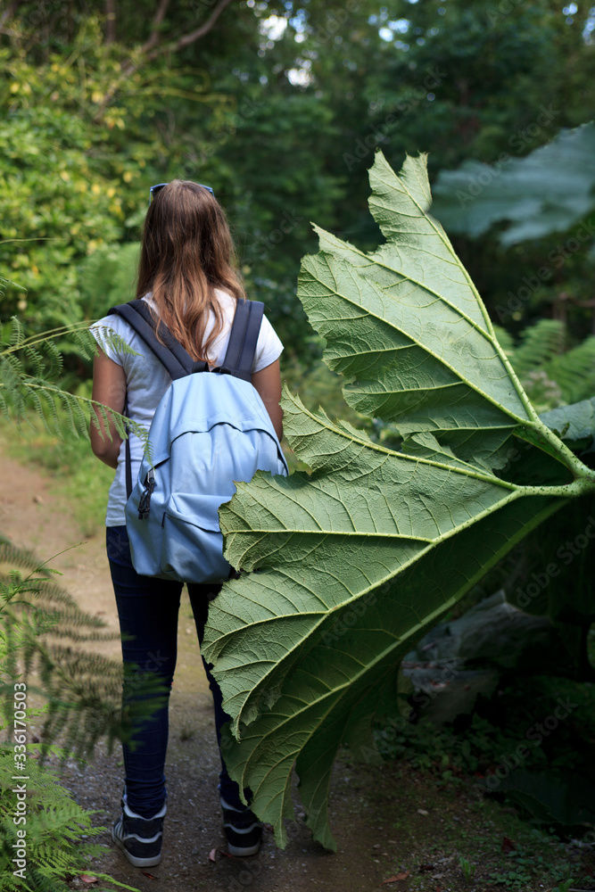 Fototapeta Saltash (England), UK - August 21, 2015: A girl near a giant rhubarb in Cotehele park, near Saltash, Cornwall, England, United Kingdom