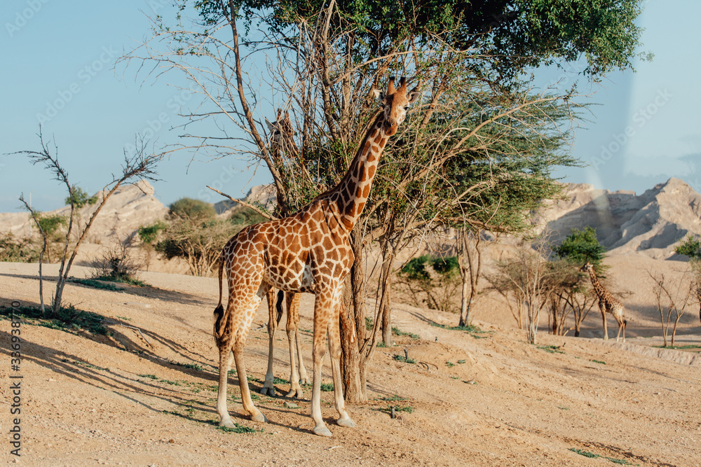 Fototapeta giraffes reaching for leaves in UAE