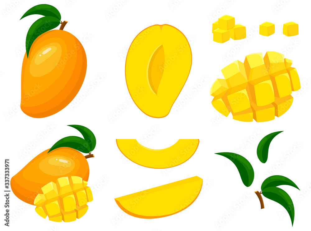 Fototapeta Set of fresh whole, half, cut slice mango fruits isolated on white background