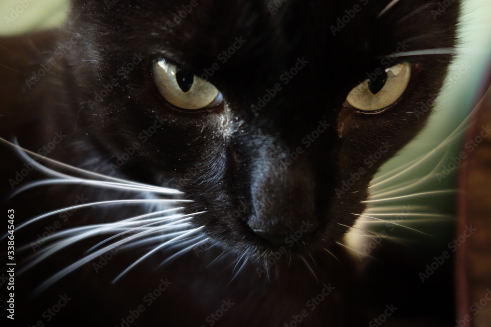 Fototapeta Close up of black cat with green eyes and white whiskers