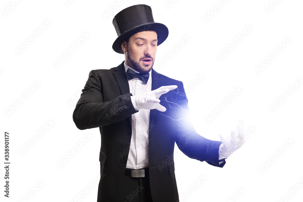 Fototapeta Magician performing a trick with electricity with his hands