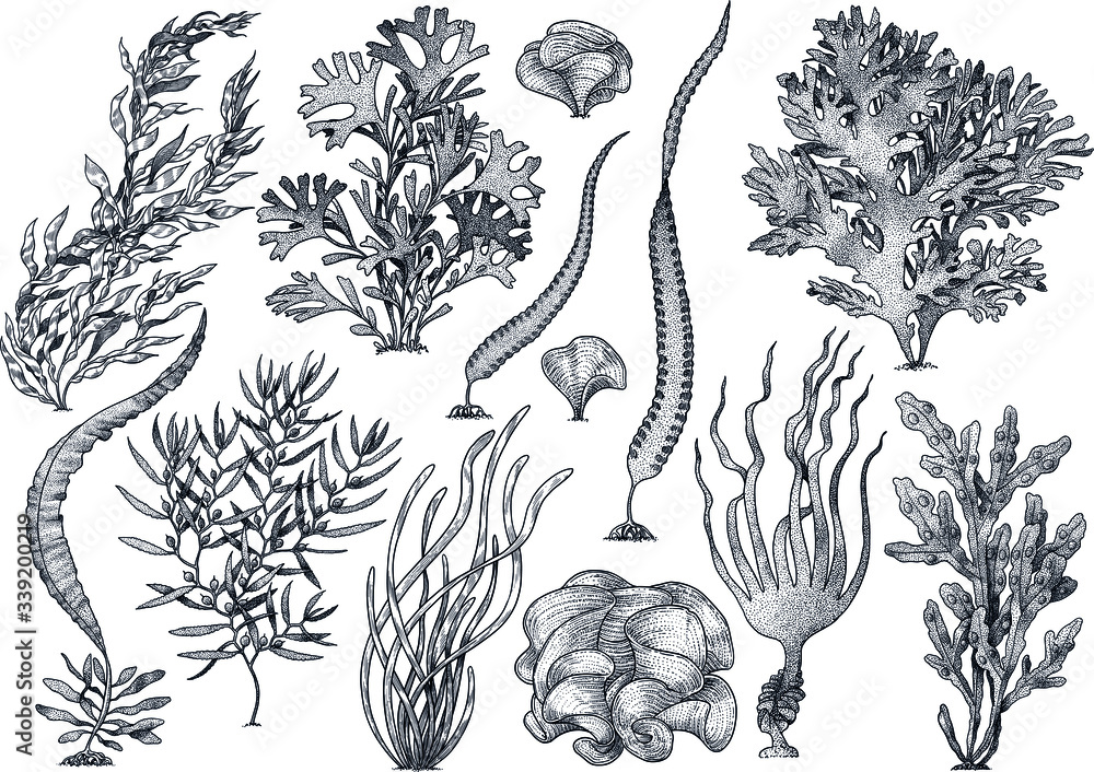 Fototapeta Seaweed, kelp collection, illustration, drawing, colorful doodle vector