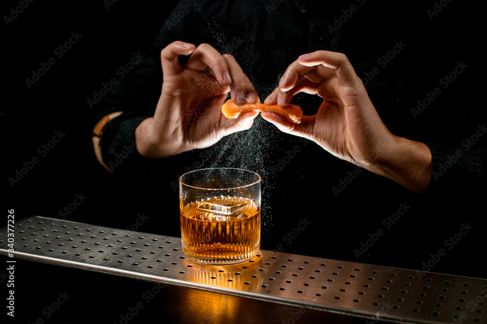 Fototapeta Close-up bartender sprinkling alcohol cocktail with piece of citrus zest