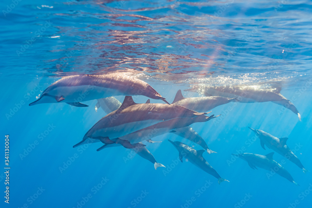 Fototapeta Pod of dolphins swimming near surface of clear blue ocean