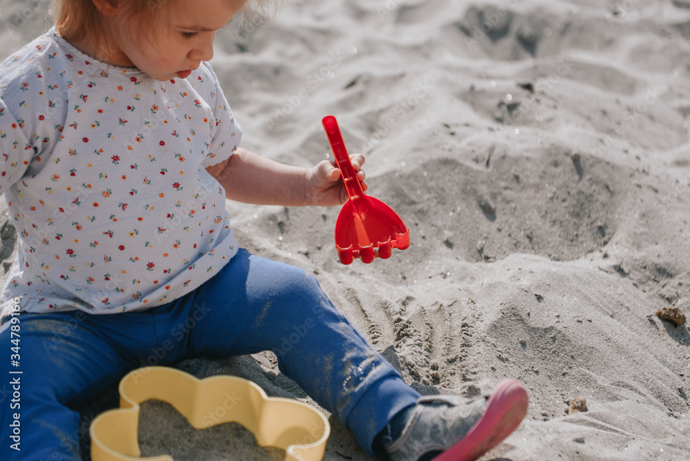 Fototapeta Little girl playing in the sand with boxes and sand shovel