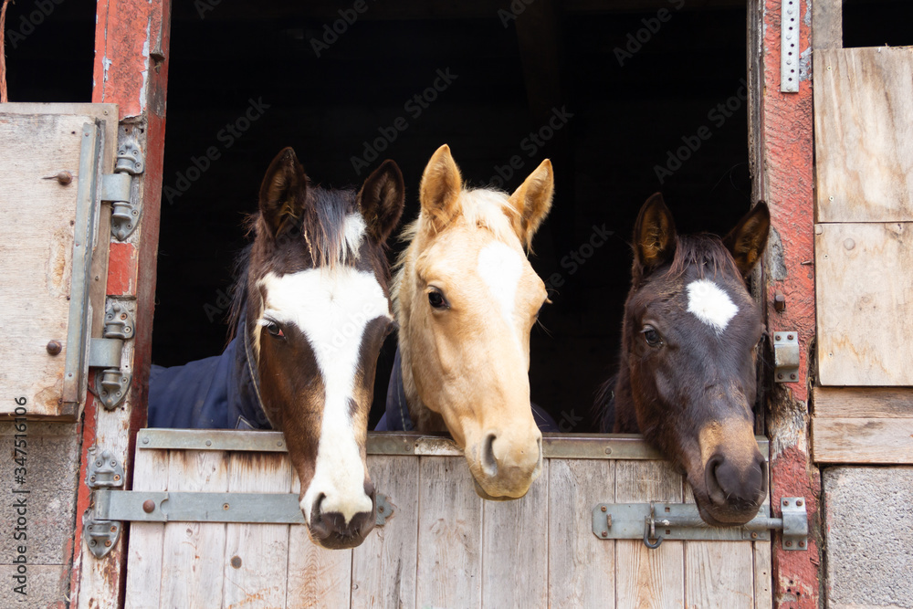Fototapeta Three ponies sharing a stable watch life over the door.
