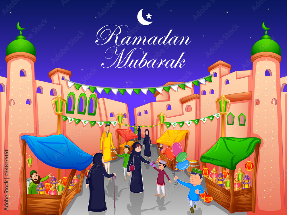 Fototapeta Happy muslim family celebrating Eid holiday on Ramadan in vector