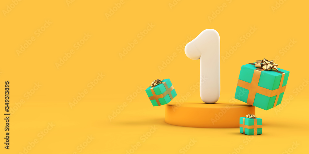Fototapeta Happy 1st birthday number and gifts on a yellow podium. 3D Render