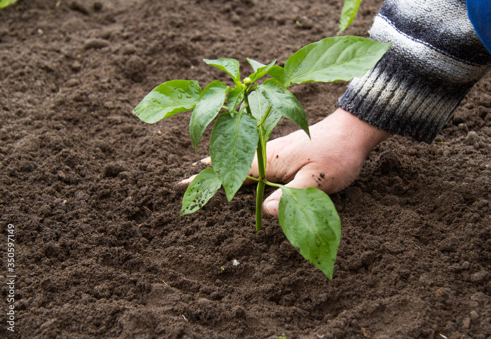 Fototapeta The man's hand burys the ground near the planted pepper plant
