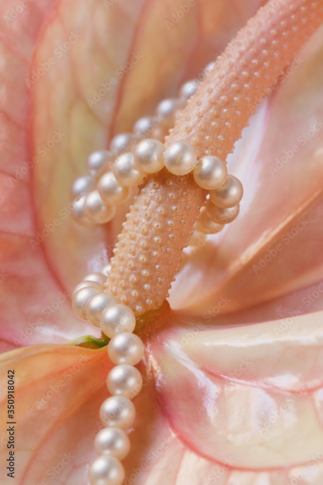Fototapeta Anthurium andraeanum close up decorated with pearl beads.