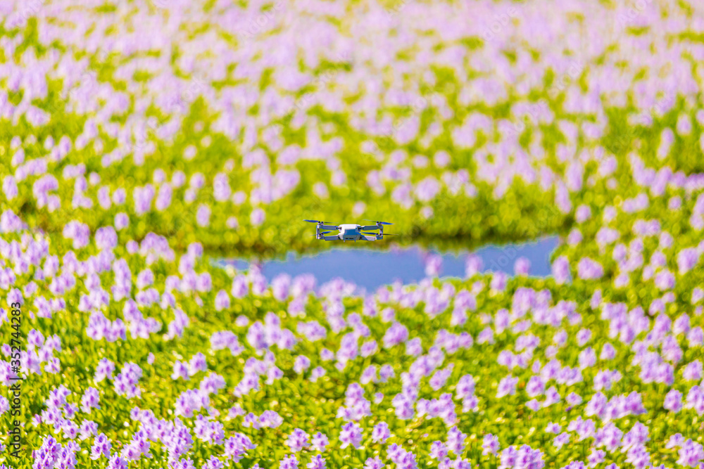 Fototapeta A droid flying on top of the sea of flower (Common water hyacinth blossom) in Ho