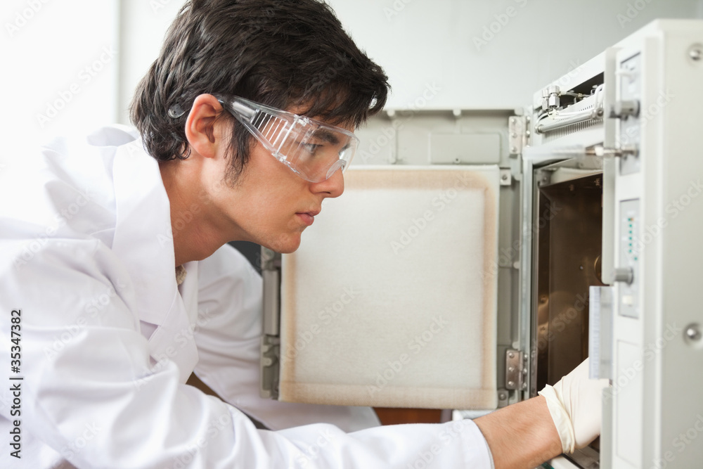 Fototapeta Close up of a scientist using a laboratory chamber furnace