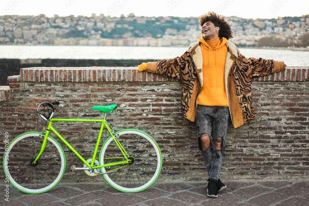 Fototapeta Happy stylish millennial guy having fun outdoor - Young mixed race trendy man ar