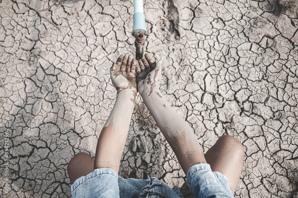 Fototapeta The little boy waiting for drinking water to live through this drought, Concept drought and crisis environment