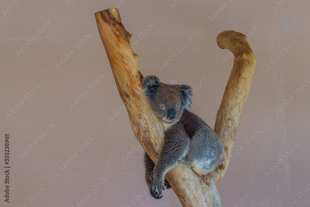 Fototapeta Koala on a tree trunk at Cleland wildlife park near Adelaide, Australia