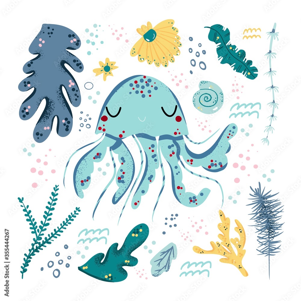 Fototapeta Jelyfish cute doodle hand drawn flat vector illustration