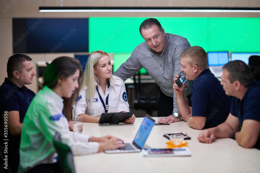 Fototapeta Group of security guards sitting and having briefing