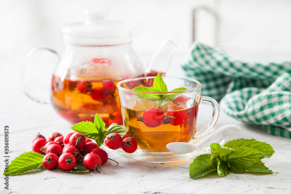 Fototapeta tea with a hawthorn and mint in a cup on a table, selective focus