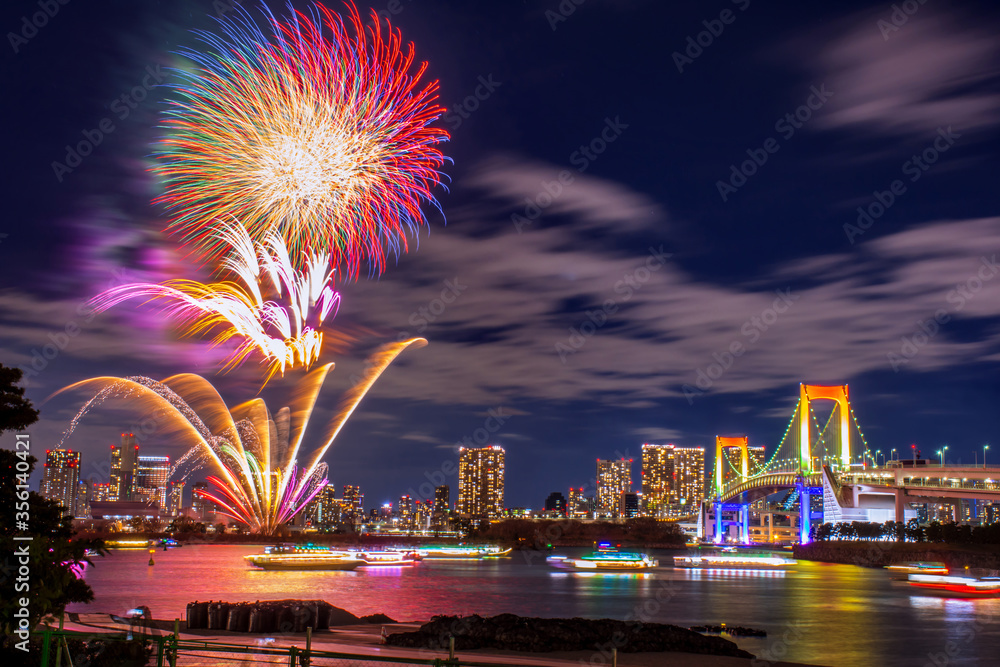 Fototapeta Odaiba, Tokyo, Beautiful and colorful firework with rainbow bridge and Tokyo city night view, event every summer and winter