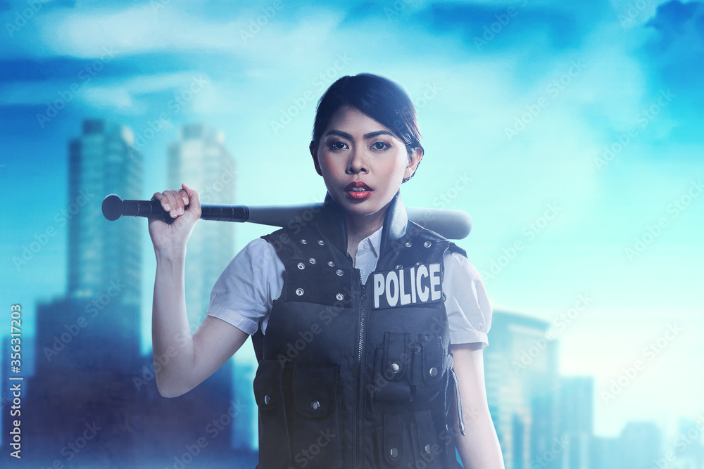 Fototapeta Asian woman in police vest standing with a baseball bat