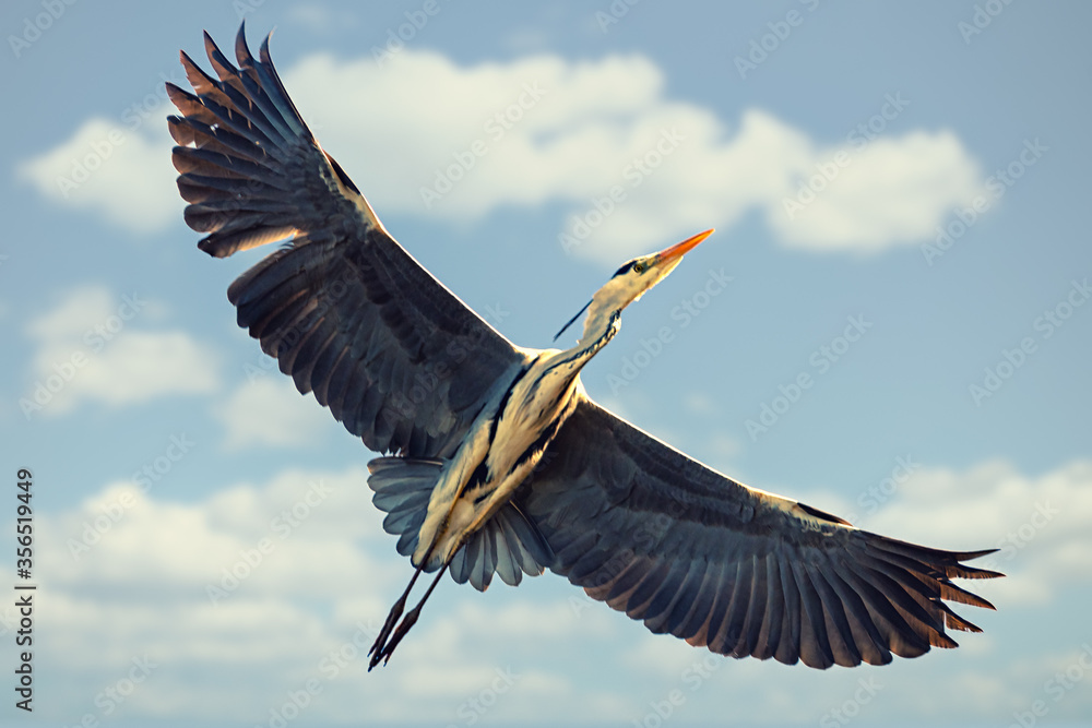 Fototapeta Grey heron passing by on a blue sky during early summer