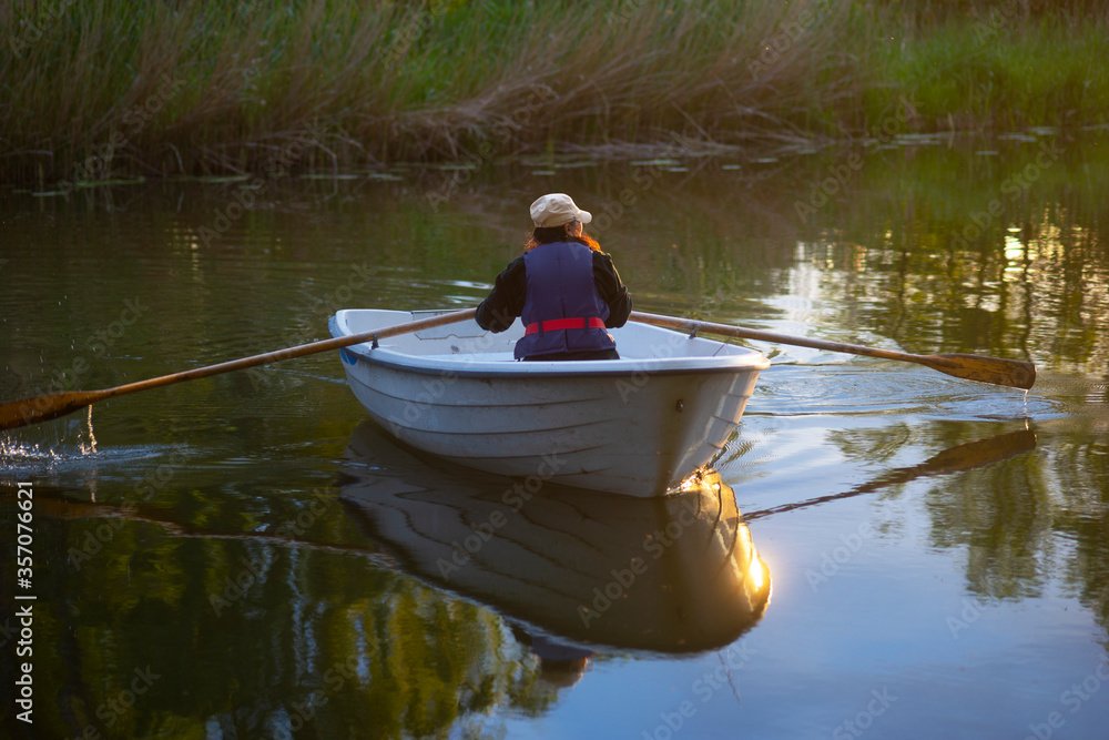 Fototapeta Woman with life jacket in rowboat in river in tranquil summer evening
