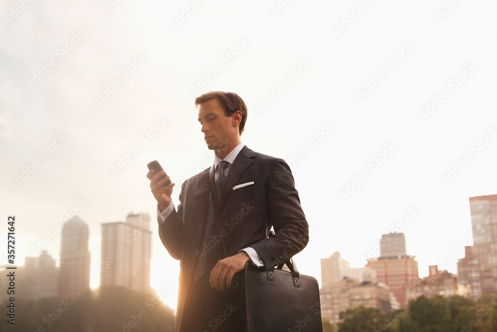 Fototapeta Businessman using cell phone in urban park