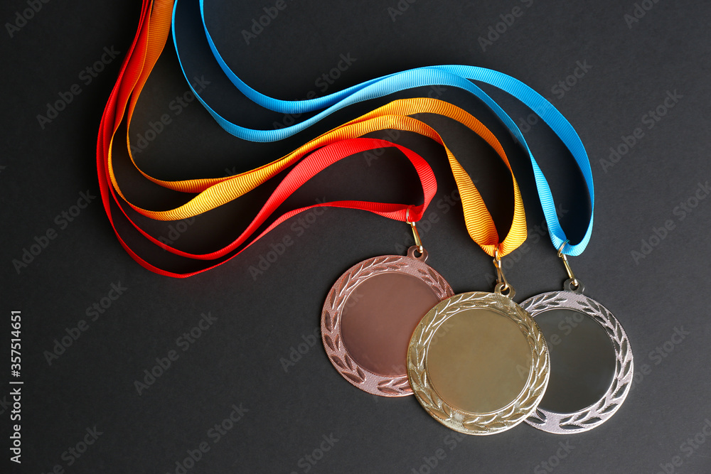 Fototapeta Gold, silver and bronze medals on black background, flat lay