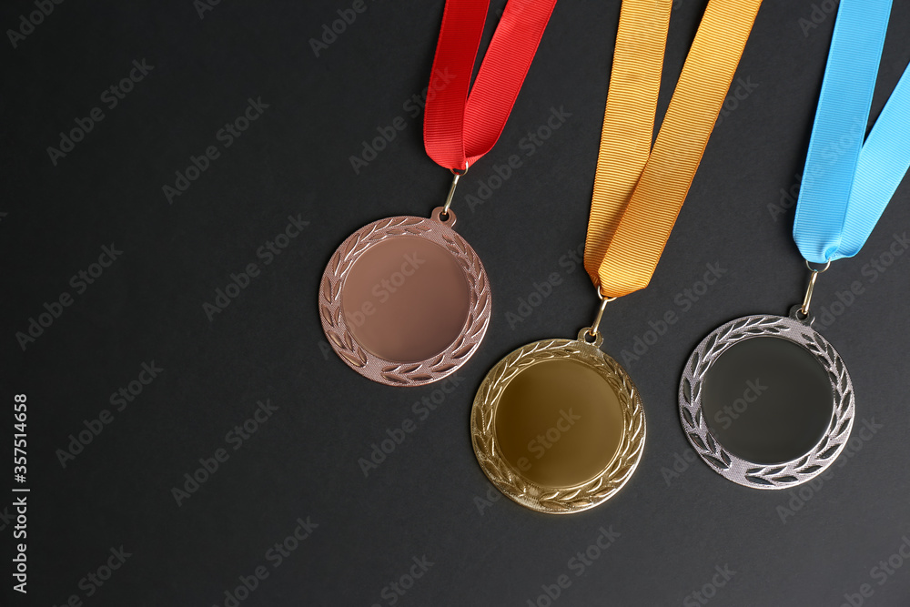 Fototapeta Gold, silver and bronze medals on black background, flat lay