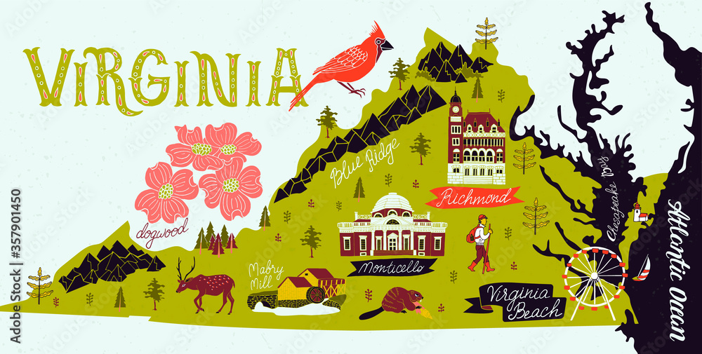 Fototapeta Illustrated map of Virginia, USA. Travel and attractions