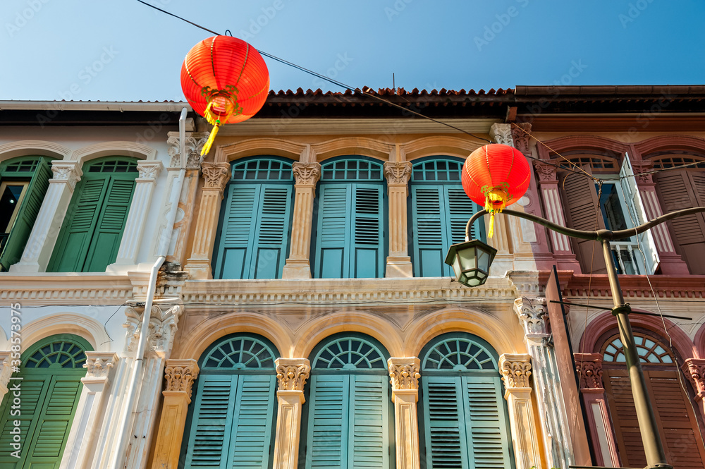 Fototapeta Colourful Shophouse Window Shutters in Chinatown, Singapore