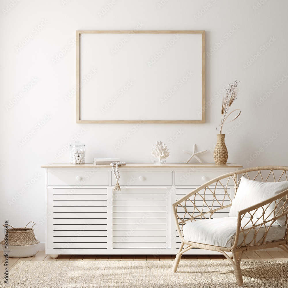 Fototapeta Mockup frame in cozy coastal style home interior, 3d render