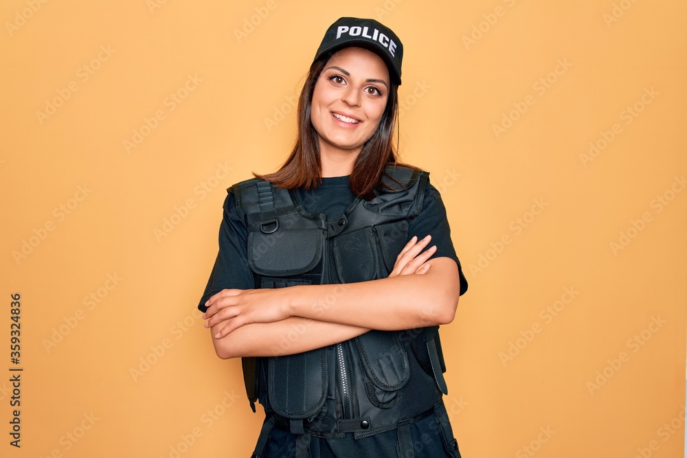 Fototapeta Young beautiful brunette policewoman wearing police uniform bulletproof and cap happy face smiling with crossed arms looking at the camera