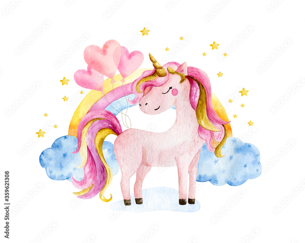 Fototapeta Isolated cute watercolor unicorn and rainbow clipart