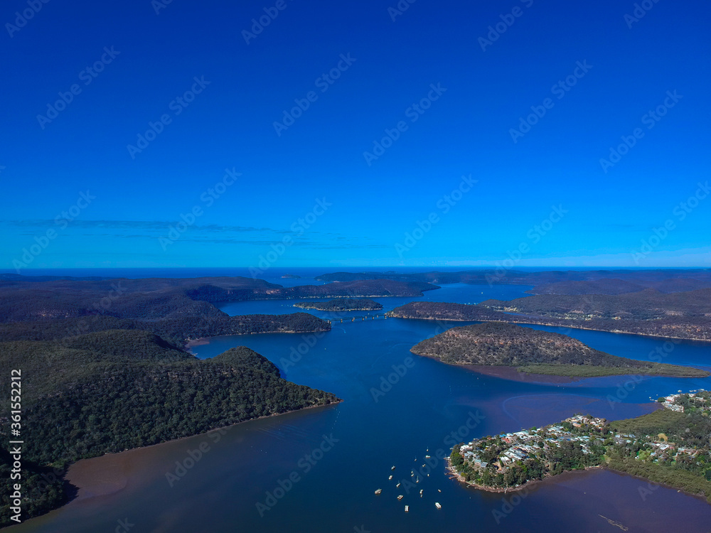 Fototapeta Panoramic drone aerial view of Mooney Money Hawkesbury River in NSW Australia be