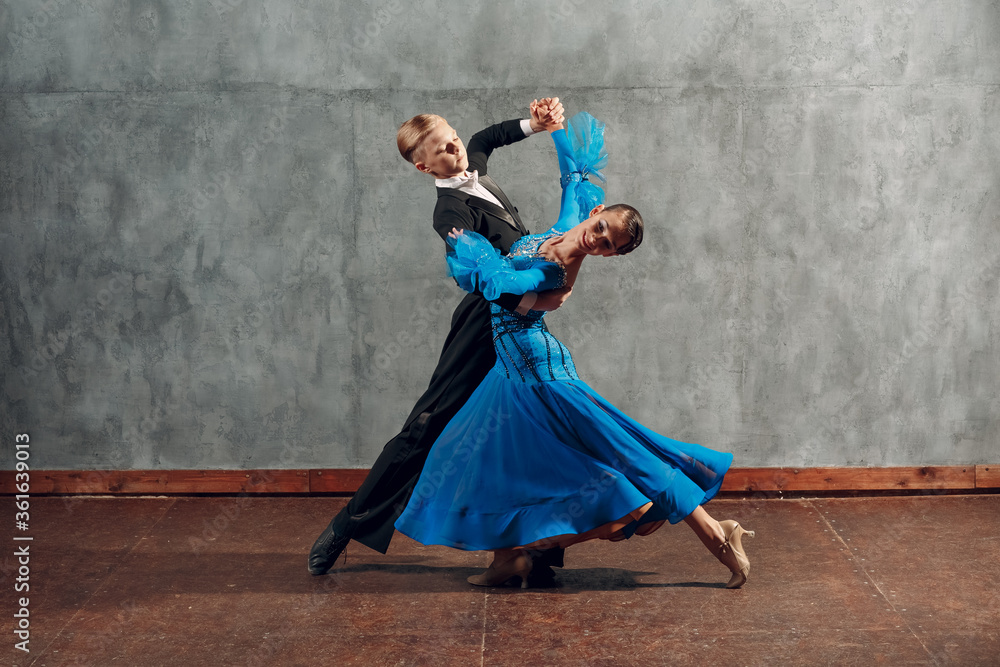 Fototapeta Young couple dance slow waltz in ballroom.