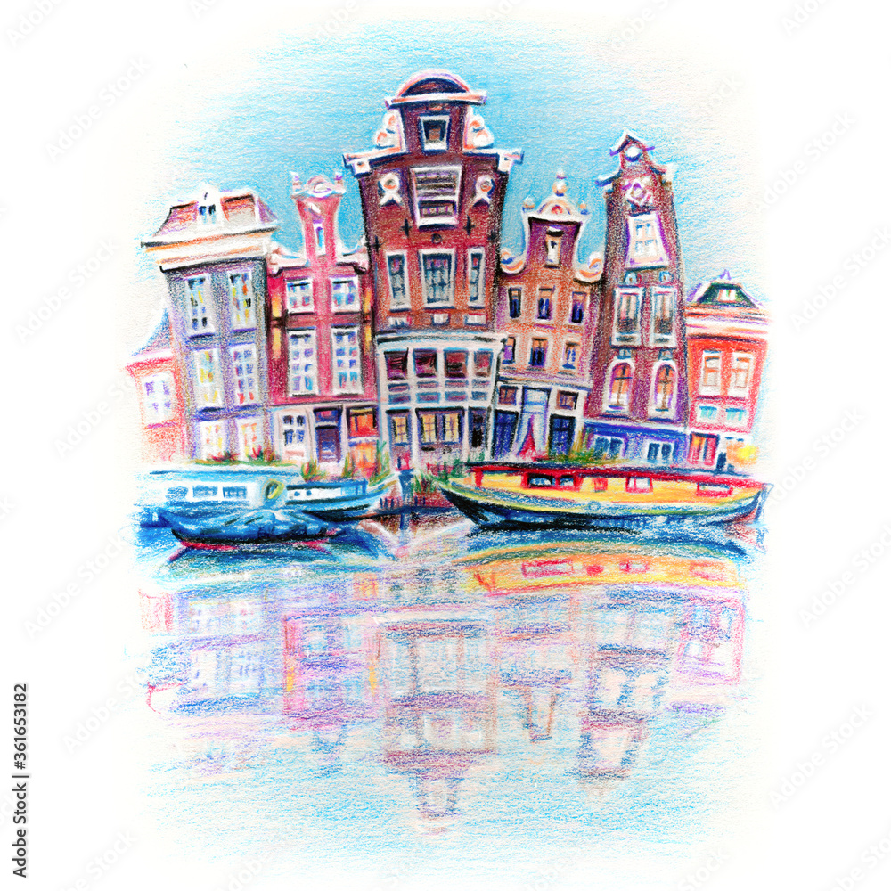 Fototapeta Colour pencil sketch of Amsterdam typical houses with their reflections in canal
