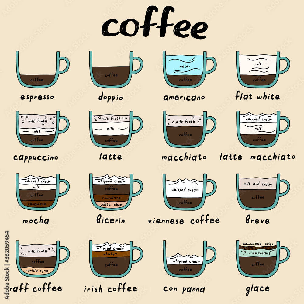 Fototapeta Hand drawn types of coffee vector poster