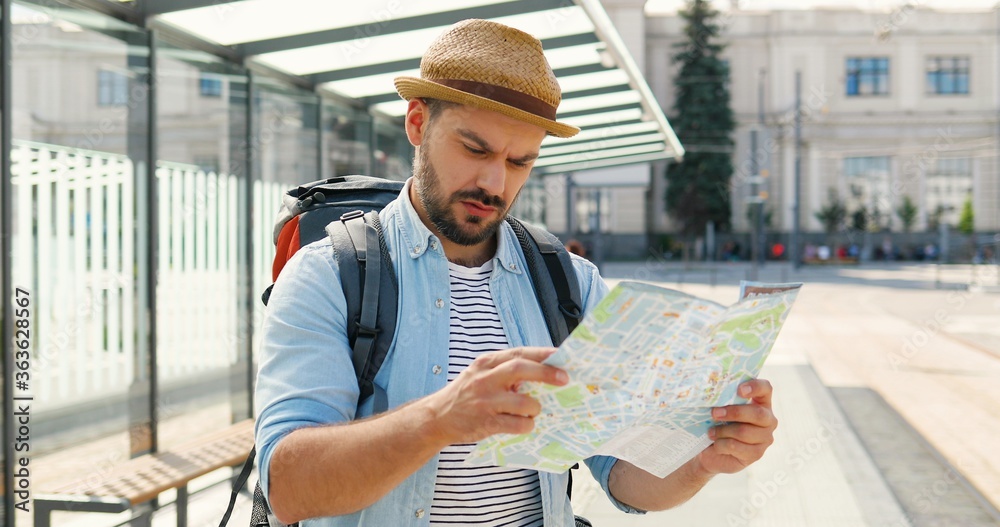 Fototapeta Young handsome Caucasian man tourist in hat with backpack holding city map and planning route