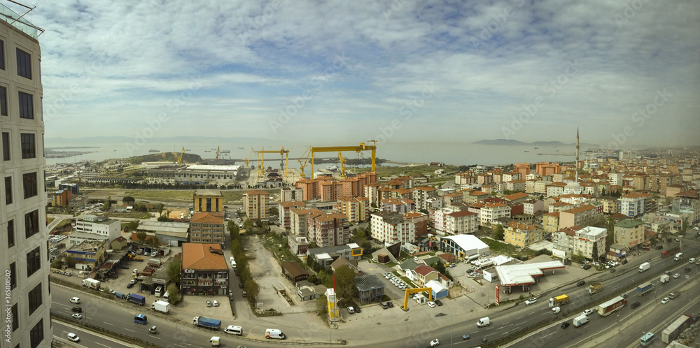 Fototapeta Panoramic view of highway in Istanbul with tuzla shipyard, islands and sea in the background